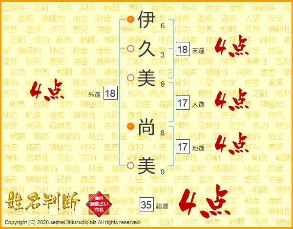 伊(6画)久(3画)美(9画) 尚(8画)美(9画)
