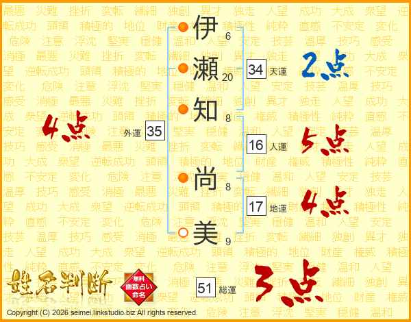伊(6画)瀬(20画)知(8画) 尚(8画)美(9画)