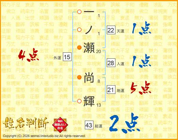 一ノ瀬尚輝さんの総運は43画の2点!