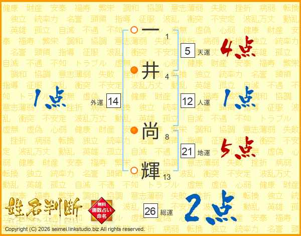 生活面を象徴する運勢です。外部から受ける影響力を表し、結婚運、家庭運や職場、環境への順応性を表します。総運から人運を引いた画数。姓や名が1文字の場合を除く。