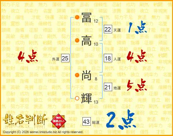 冨(12画)高(10画) 尚(8画)輝(13画)