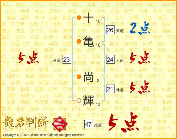 十(10画)亀(16画) 尚(8画)輝(13画)