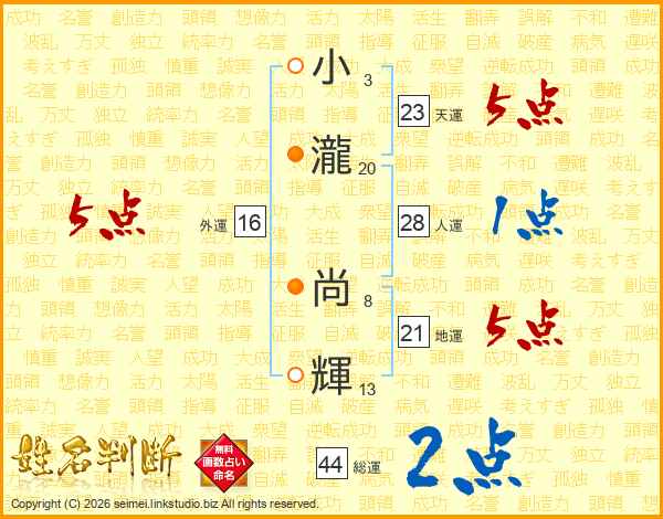 小(3画)瀧(20画) 尚(8画)輝(13画)