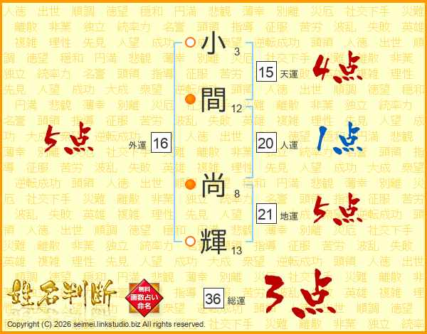 小(3画)間(12画) 尚(8画)輝(13画)