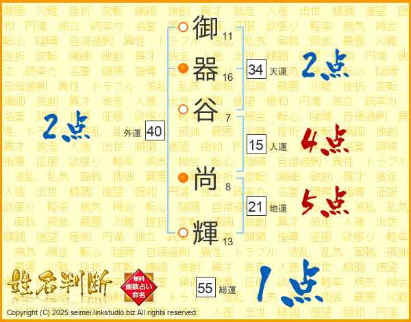 御(11画)器(16画)谷(7画) 尚(8画)輝(13画)
