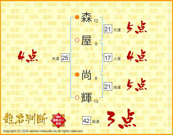 森(12画)屋(9画) 尚(8画)輝(13画)