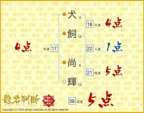 犬(4画)飼(14画) 尚(8画)輝(13画)