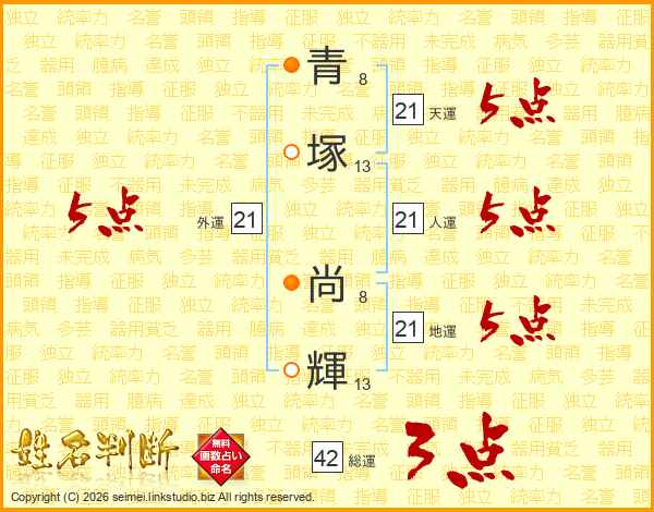 青(8画)塚(13画) 尚(8画)輝(13画)