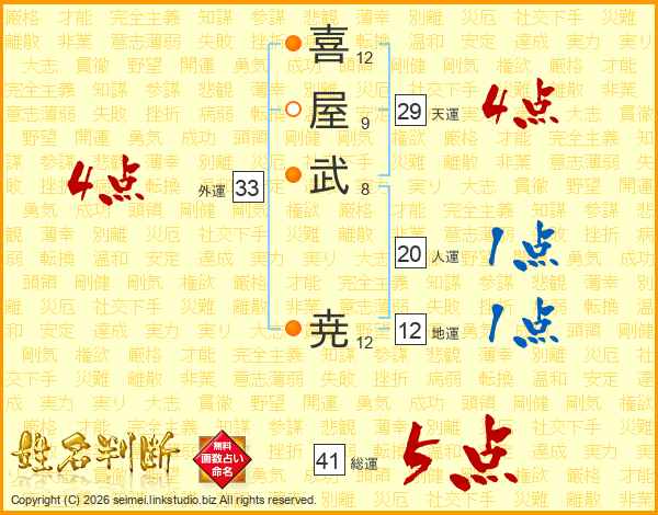 喜(12画)屋(9画)武(8画) 尭(12画)