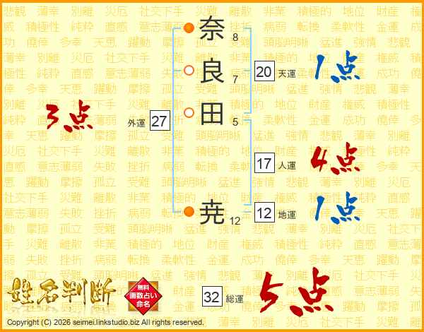 奈良田尭さんの総運は32画の5点!
