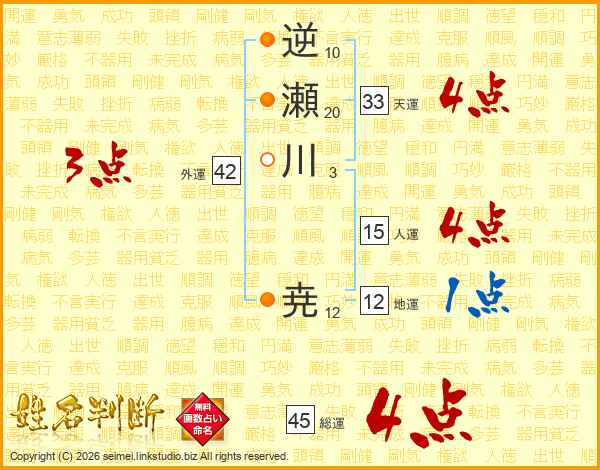 生活面を象徴する運勢です。外部から受ける影響力を表し、結婚運、家庭運や職場、環境への順応性を表します。総運から人運を引いた画数。姓や名が1文字の場合を除く。