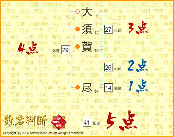 あなたの人生を表す1番重要な運勢です。生涯を通じて影響する総合運となり、主に50歳以降の晩年期に影響を及ぼします。苗字と名前の合計画数。