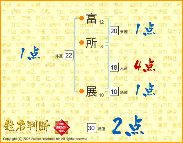 生活面を象徴する運勢です。外部から受ける影響力を表し、結婚運、家庭運や職場、環境への順応性を表します。総運から人運を引いた画数。姓や名が1文字の場合を除く。