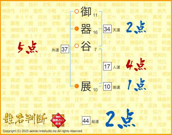 生活面を象徴する運勢です。外部から受ける影響力を表し、結婚運、家庭運や職場、環境への順応性を表します。総運から人運を引いた画数。姓や名が1文字の場合を除く。