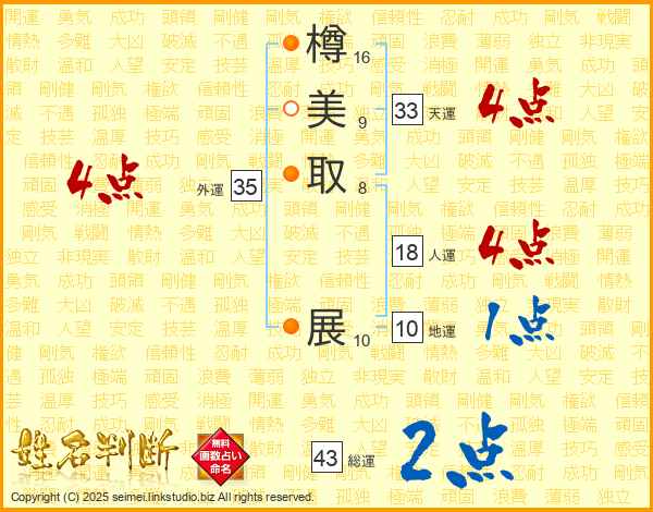 生活面を象徴する運勢です。外部から受ける影響力を表し、結婚運、家庭運や職場、環境への順応性を表します。総運から人運を引いた画数。姓や名が1文字の場合を除く。