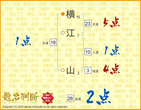 生活面を象徴する運勢です。外部から受ける影響力を表し、結婚運、家庭運や職場、環境への順応性を表します。総運から人運を引いた画数。姓や名が1文字の場合を除く。