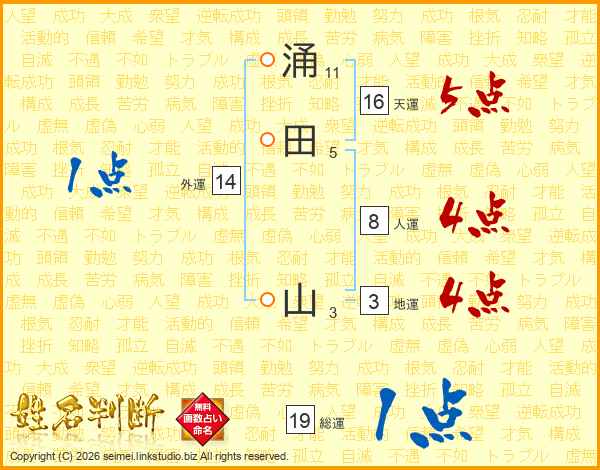 涌田山さんの天運は16画の5点!