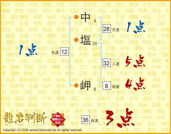 中(4画)塩(24画) 岬(8画)