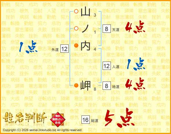 山(3画)ノ(1画)内(4画) 岬(8画)