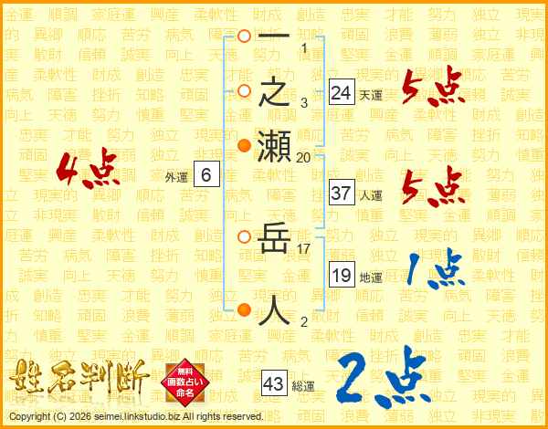 一(1画)之(3画)瀬(20画) 岳(17画)人(2画)