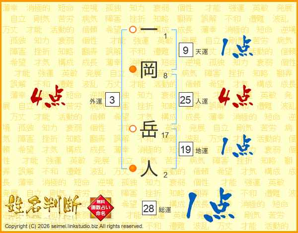 生活面を象徴する運勢です。外部から受ける影響力を表し、結婚運、家庭運や職場、環境への順応性を表します。総運から人運を引いた画数。姓や名が1文字の場合を除く。