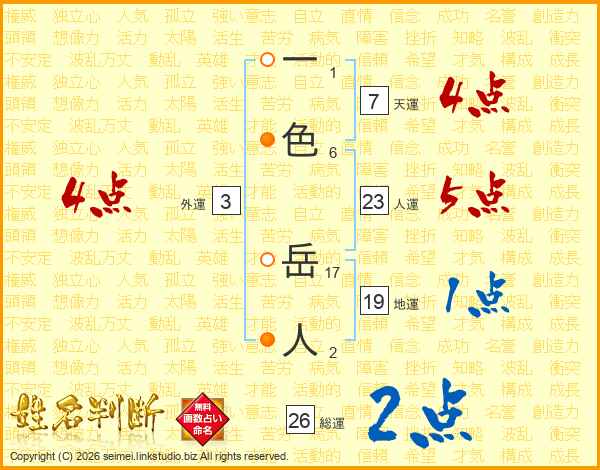 一色岳人さんの総運は26画の2点!