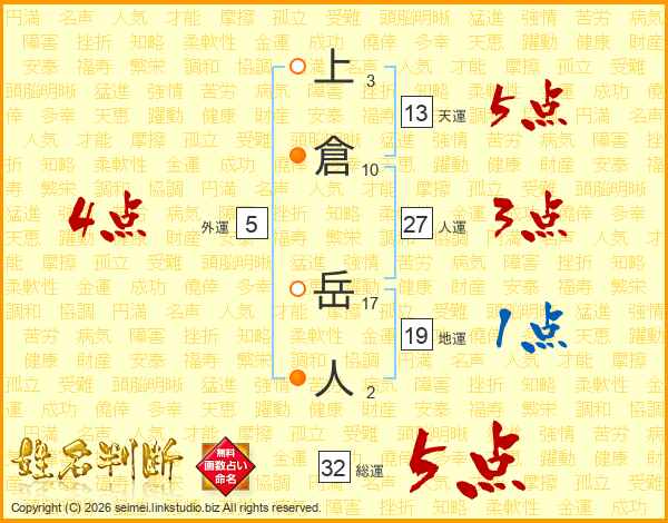 上倉岳人さんの総運は32画の5点!