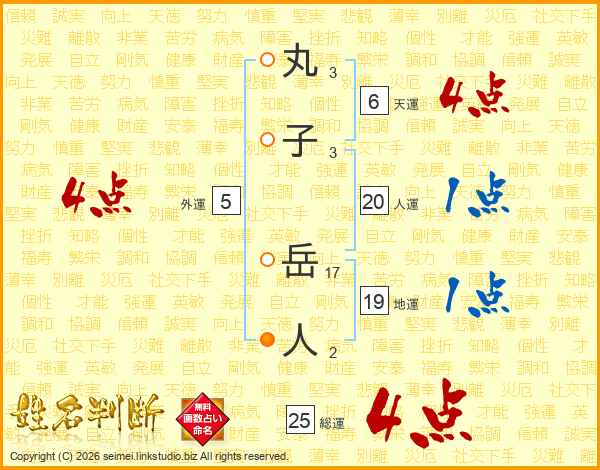 あなたの人生を表す1番重要な運勢です。生涯を通じて影響する総合運となり、主に50歳以降の晩年期に影響を及ぼします。苗字と名前の合計画数。
