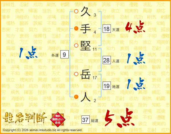 久(3画)手(4画)堅(11画) 岳(17画)人(2画)