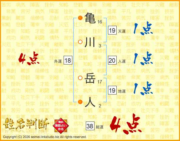 亀川岳人さんの総運は38画の4点!