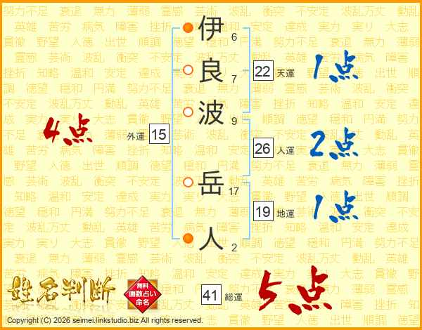 伊(6画)良(7画)波(9画) 岳(17画)人(2画)