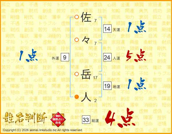 生活面を象徴する運勢です。外部から受ける影響力を表し、結婚運、家庭運や職場、環境への順応性を表します。総運から人運を引いた画数。姓や名が1文字の場合を除く。