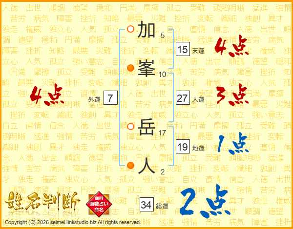 加峯岳人さんの総運は34画の2点!