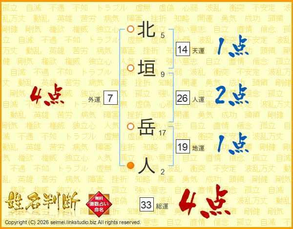 北垣岳人さんの総運は33画の4点!