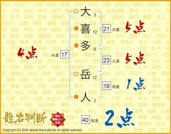 大喜多岳人さんの外運は17画の4点!