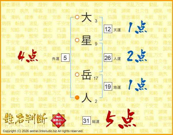 あなたの人生を表す1番重要な運勢です。生涯を通じて影響する総合運となり、主に50歳以降の晩年期に影響を及ぼします。苗字と名前の合計画数。
