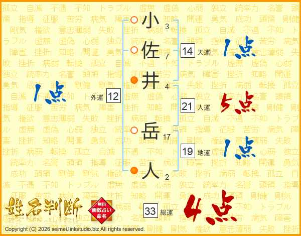 小(3画)佐(7画)井(4画) 岳(17画)人(2画)