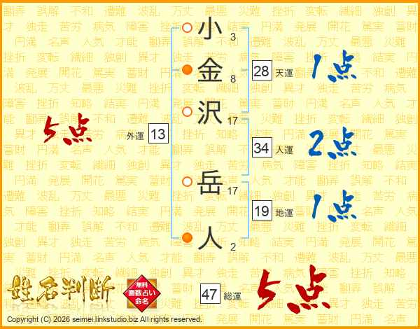 小(3画)金(8画)沢(17画) 岳(17画)人(2画)