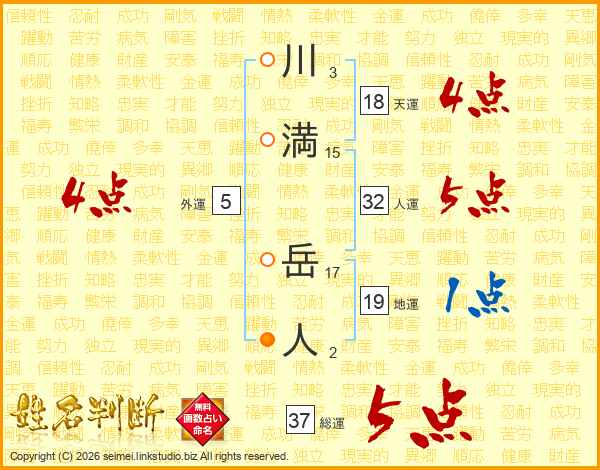 あなたの人生を表す1番重要な運勢です。生涯を通じて影響する総合運となり、主に50歳以降の晩年期に影響を及ぼします。苗字と名前の合計画数。