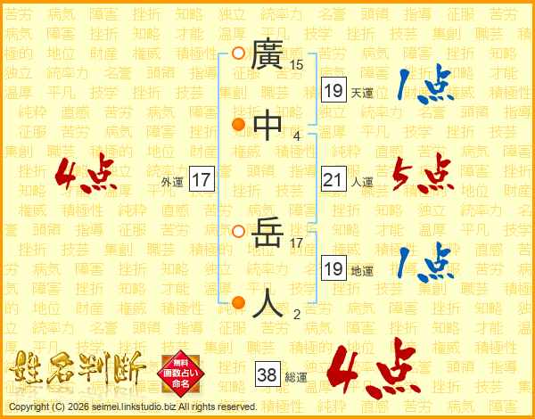 生活面を象徴する運勢です。外部から受ける影響力を表し、結婚運、家庭運や職場、環境への順応性を表します。総運から人運を引いた画数。姓や名が1文字の場合を除く。