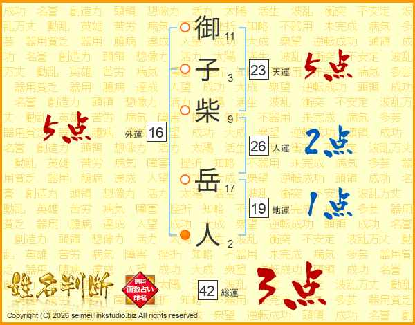 御(11画)子(3画)柴(9画) 岳(17画)人(2画)
