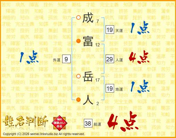 生活面を象徴する運勢です。外部から受ける影響力を表し、結婚運、家庭運や職場、環境への順応性を表します。総運から人運を引いた画数。姓や名が1文字の場合を除く。