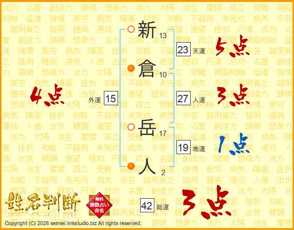 新倉岳人さんの天運は23画の5点!