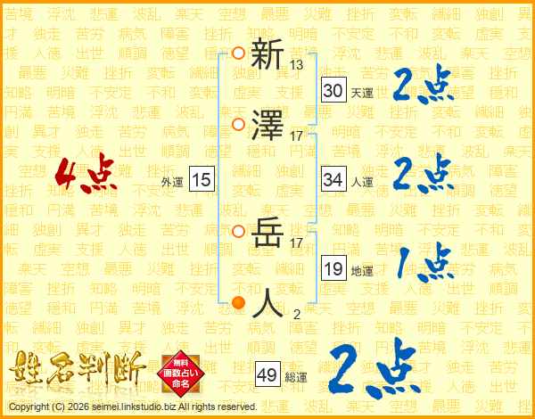 あなたの人生を表す1番重要な運勢です。生涯を通じて影響する総合運となり、主に50歳以降の晩年期に影響を及ぼします。苗字と名前の合計画数。