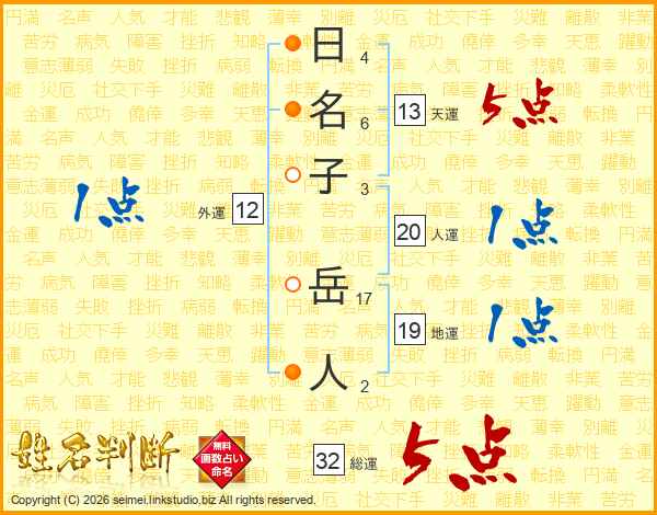日名子岳人さんの総運は32画の5点!