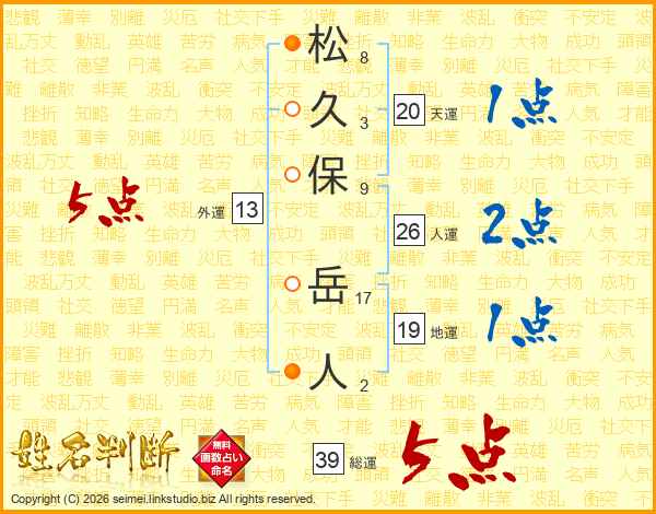 松(8画)久(3画)保(9画) 岳(17画)人(2画)