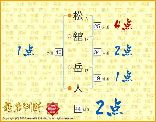 松舘岳人さんの総運は44画の2点!