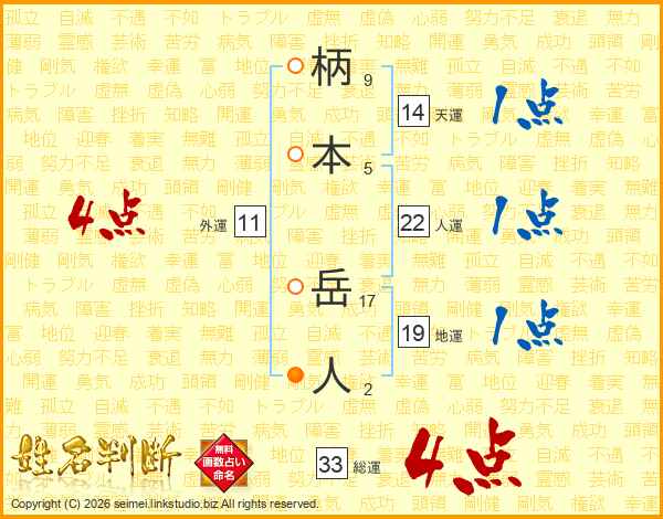 柄(9画)本(5画) 岳(17画)人(2画)
