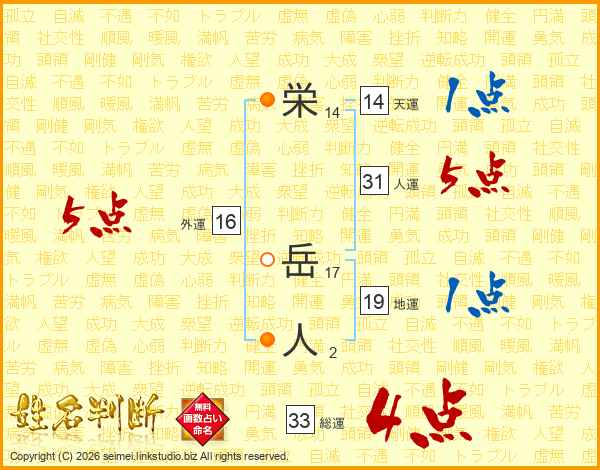生活面を象徴する運勢です。外部から受ける影響力を表し、結婚運、家庭運や職場、環境への順応性を表します。総運から人運を引いた画数。姓や名が1文字の場合を除く。