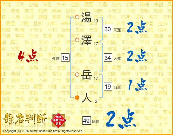 湯澤岳人さんの総運は49画の2点!